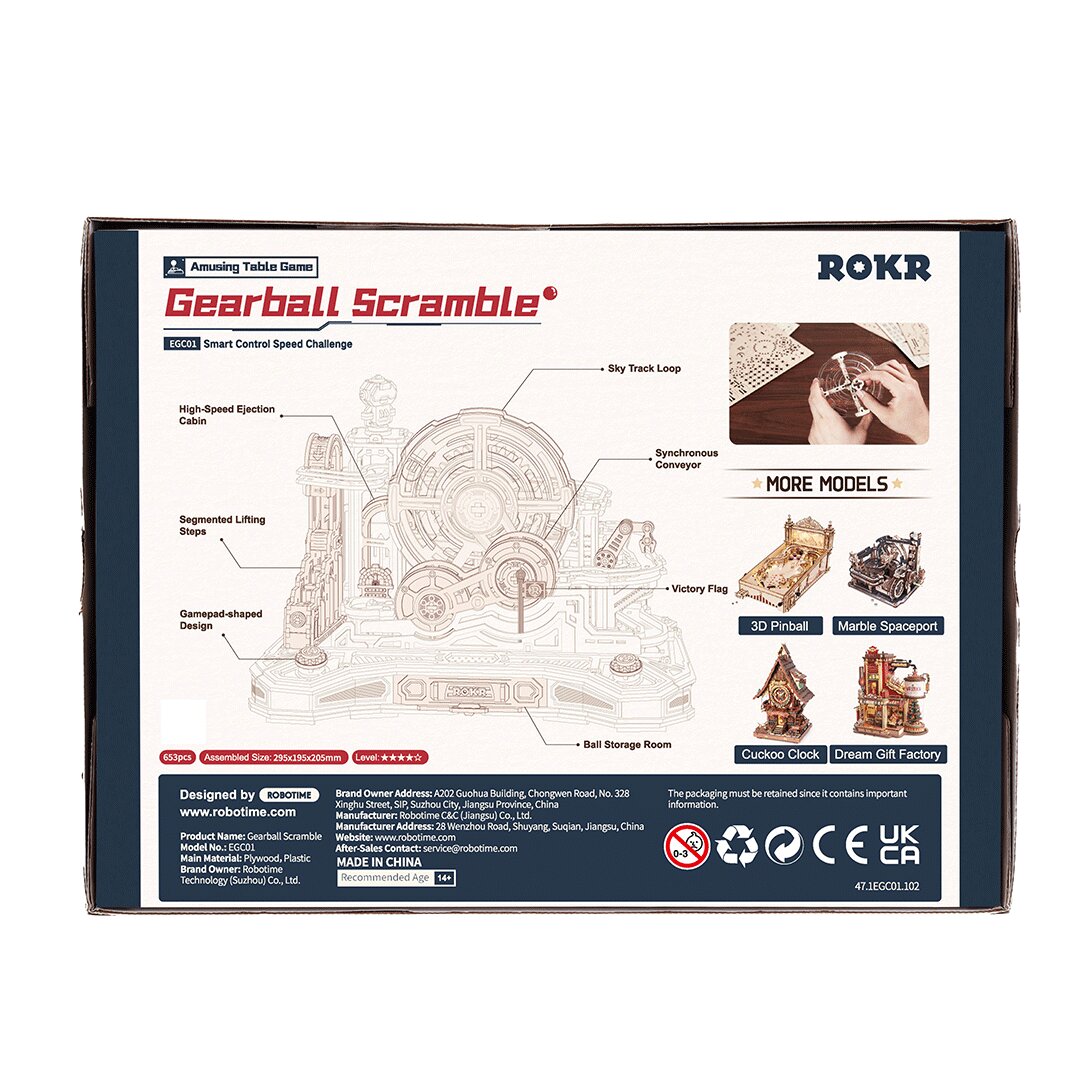 Entdecken Sie die faszinierende Welt der Mechanik mit dem interaktiven Modell ROKR Gear Ball Challenge EGC01 – einem einzigartigen 3D-Holzpuzzle, das Präzisionstechnik, Spielspaß und Lernen vereint. Inspiriert von der Form eines Gamecontrollers, bietet dieses Modell ein adrenalingeladenes Erlebnis : Steuern Sie Metallkugeln manuell durch sechs dynamische Level voller Hindernisse, Aufzüge, Schalter und Sprünge.